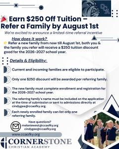 Every subject taught from Biblical worldview, praise team, small groups, athletics, weekly chapel, Middle School Dance, 8th Grade trip to DC